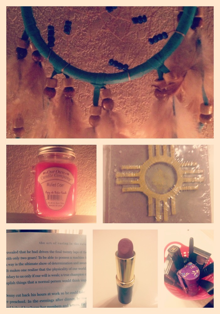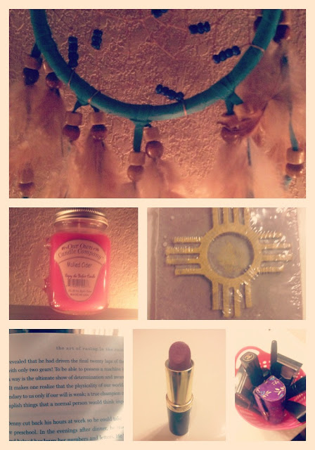 Finding comfort in a beaded-feathered turquoise dreamcatcher. Berry, cider, and apple scented candles. New Mexican handmade soap.