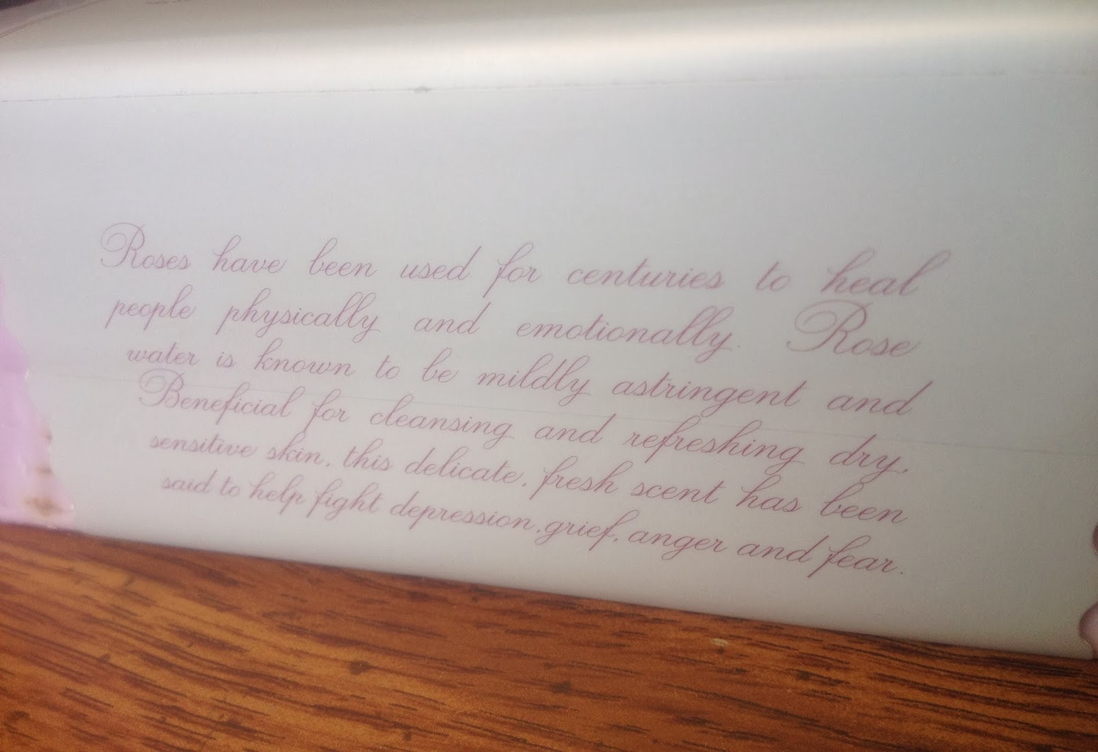 “Roses have been used for centuries to heal people physically and emotionally. Rose water is know to be mildly astringent and beneficial for cleansing and refreshing dry, sensitive skin, this delicate, fresh scent has been said to help fight depression, grief, anger, and fear.”